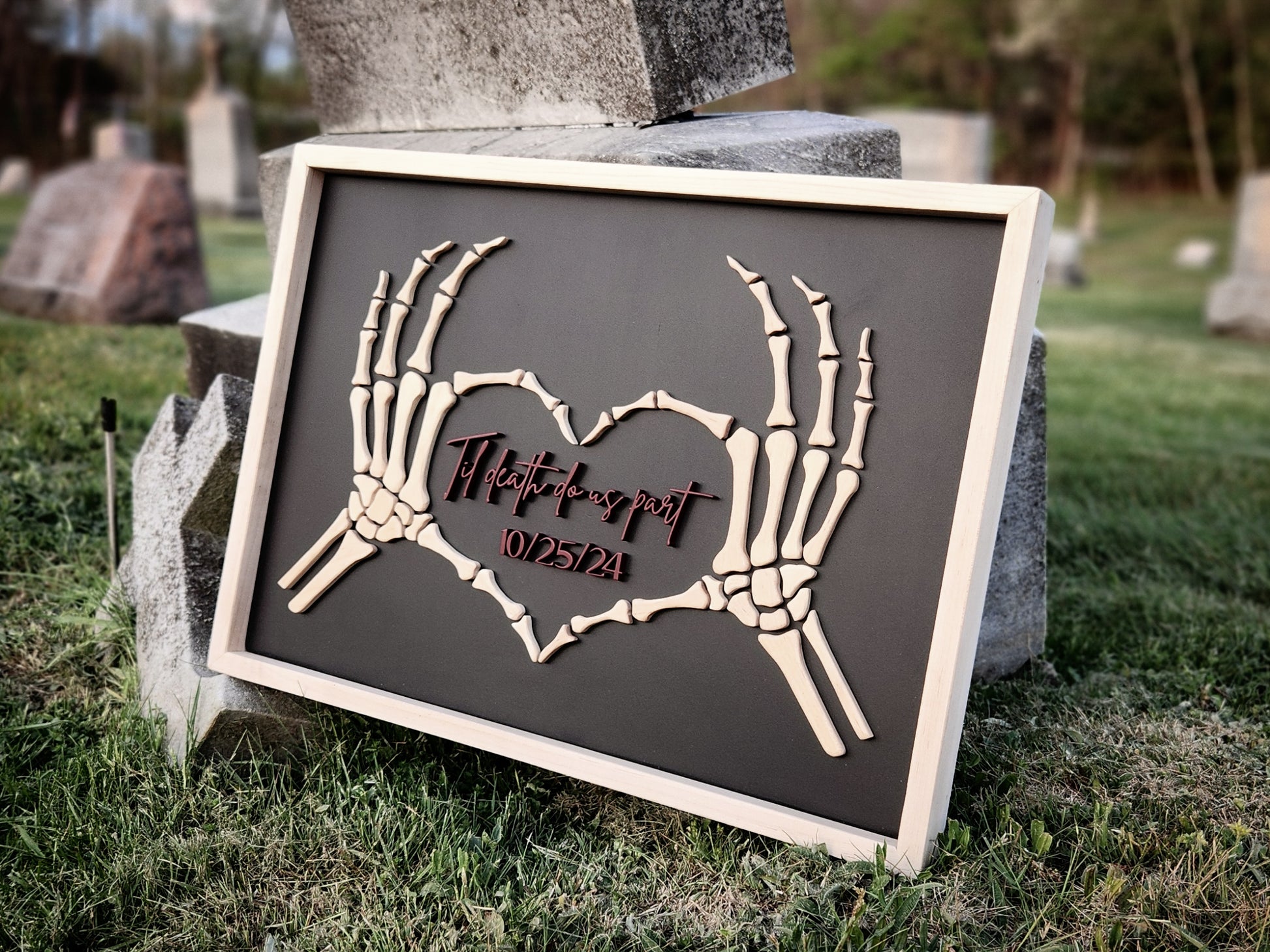 Materials: This sign is built to last, adding a touch of spooky sophistication to any space. Bones and frame are made out of hardwood maple, the black painted backer is made out of 3/4" pine plywood, and the optional words inside the heart are hand-cut and painted MDF.