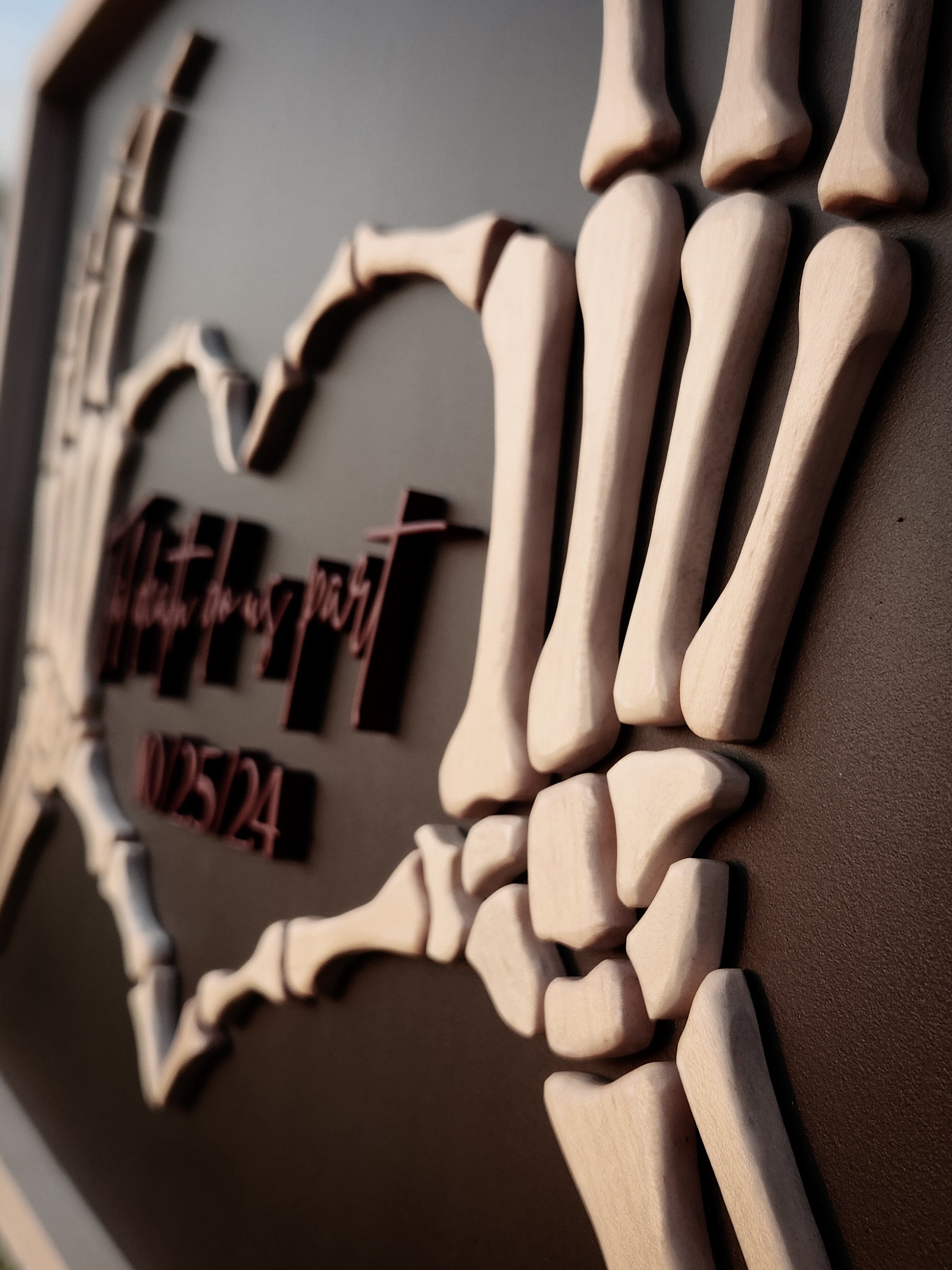 Dare to add a touch of the macabre to your decor with this handcrafted skeleton heart sign. Each bone is crafted from hardwood maple that are cut and shaped by hand, blending eerie elegance with timeless craftsmanship.